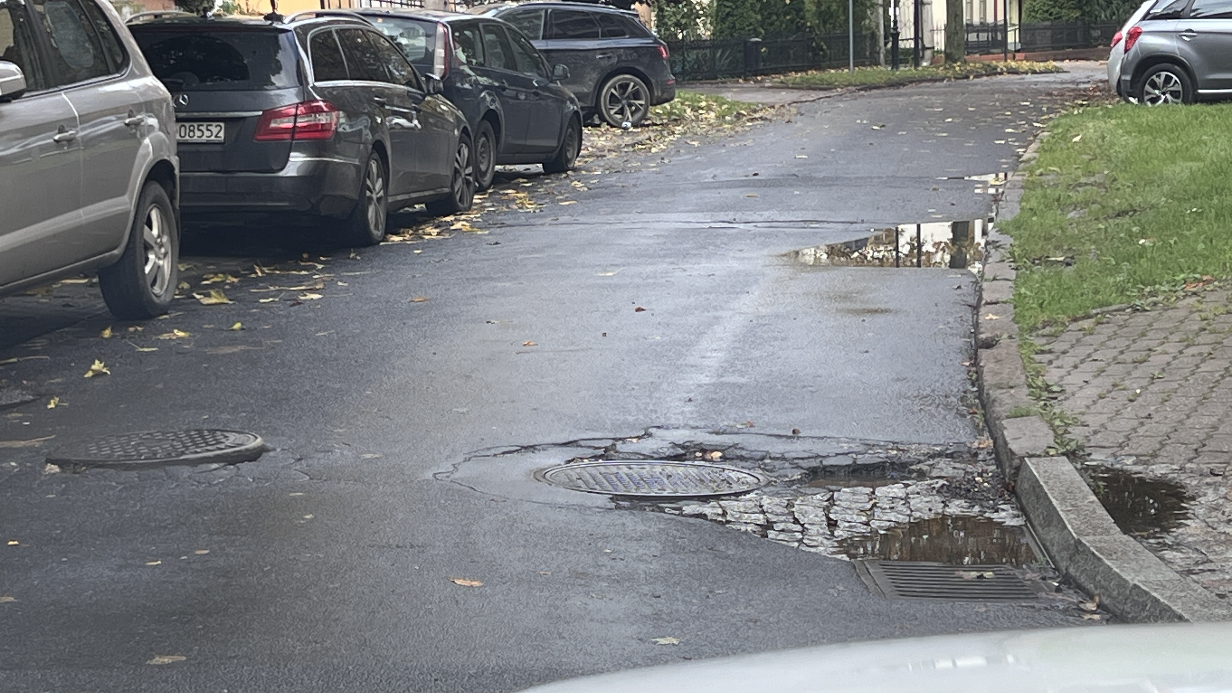 Wskazany fragment drogi posiada ubytki w nawierzchni asfaltowej oraz wystającą studzienkę kanalizacyjną, co stanowi zagrożenie dla bezpieczeństwa ruchu drogowego — zarówno dla kierowców, jak i pieszych. W zagłębieniach często gromadzi się woda, co dodatkowo utrudnia widoczność uszkodzeń i zwiększa ryzyko uszkodzenia pojazdów.