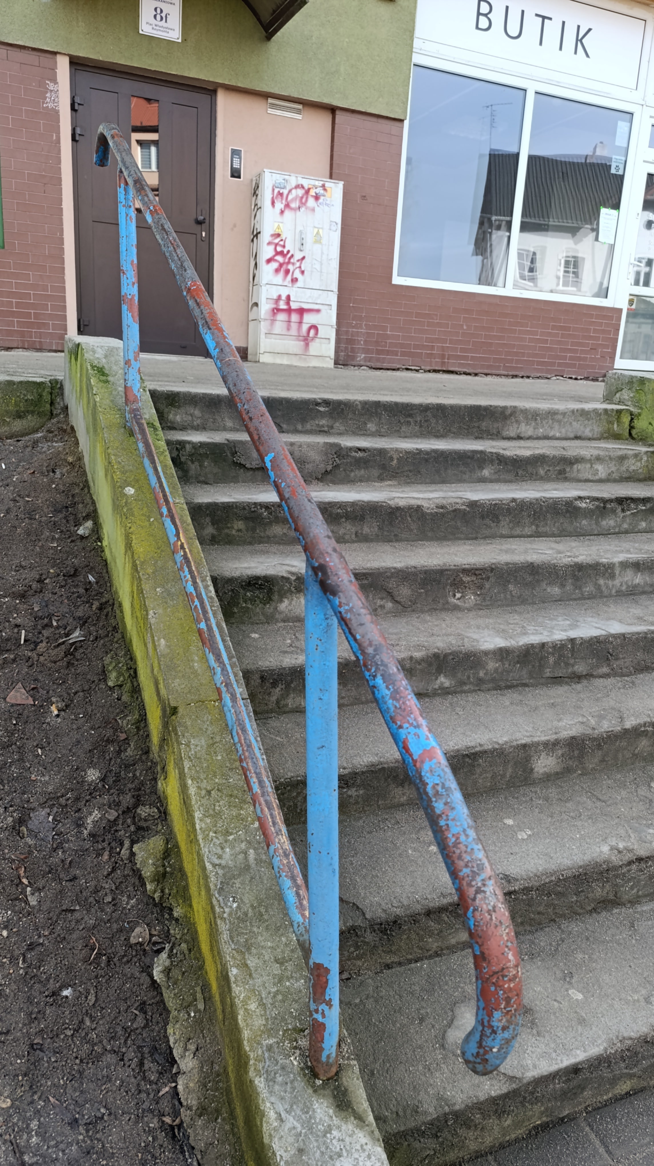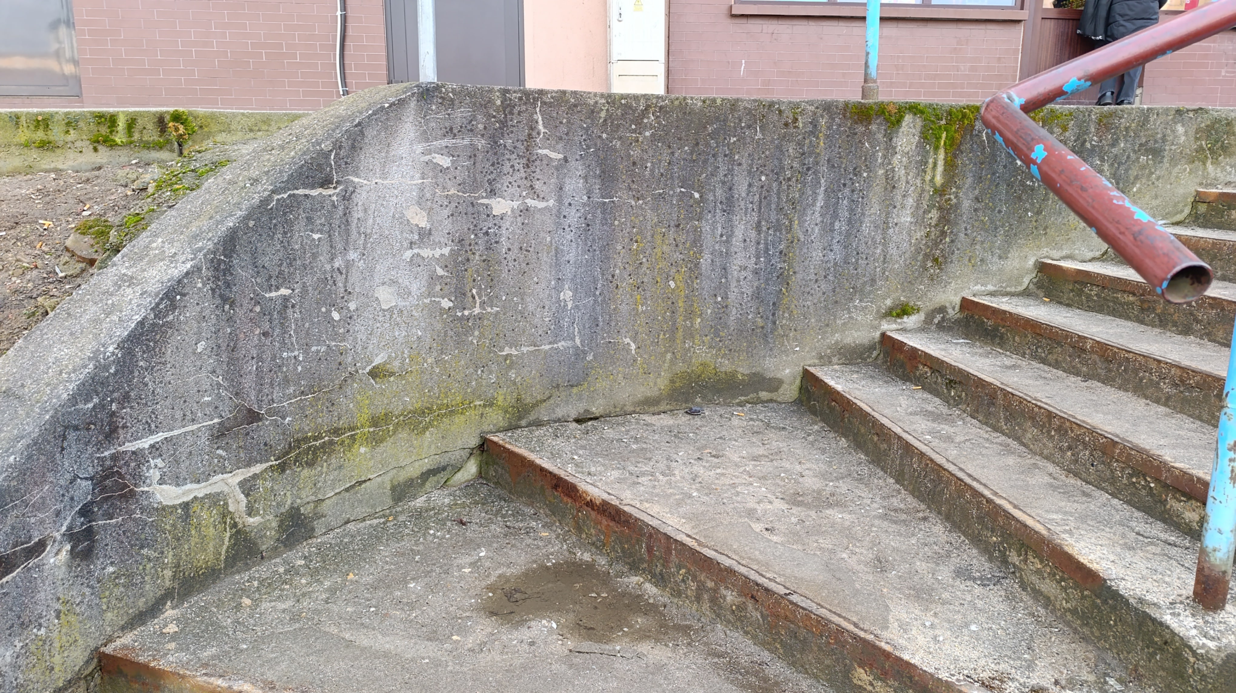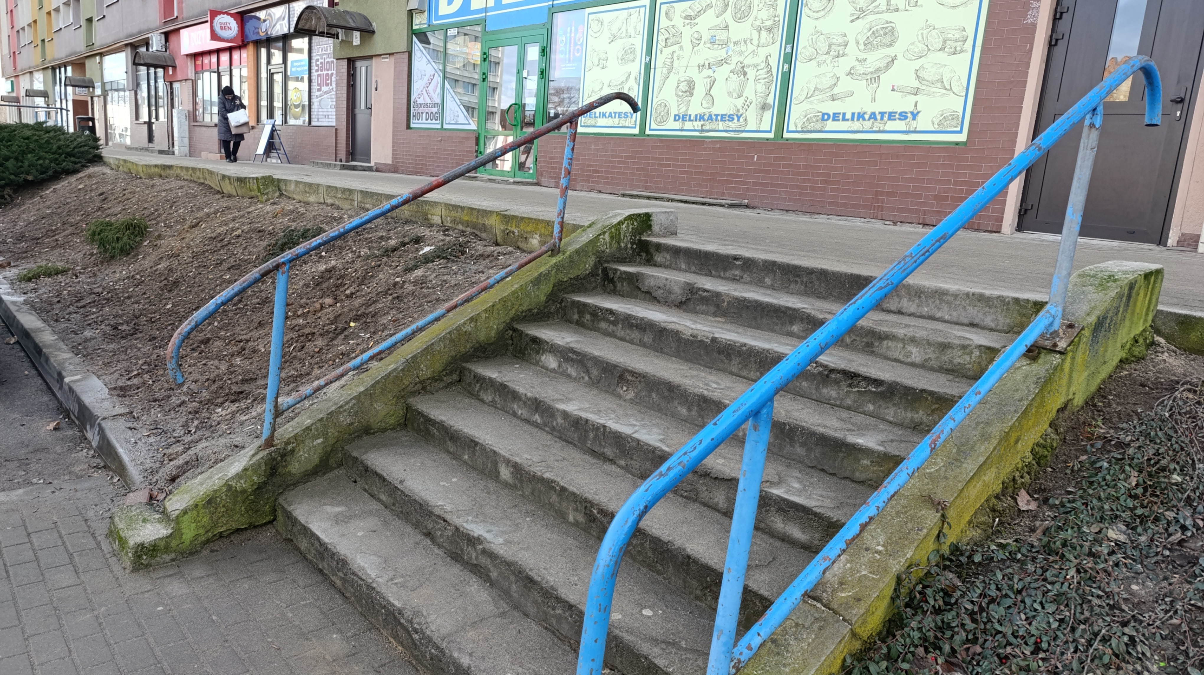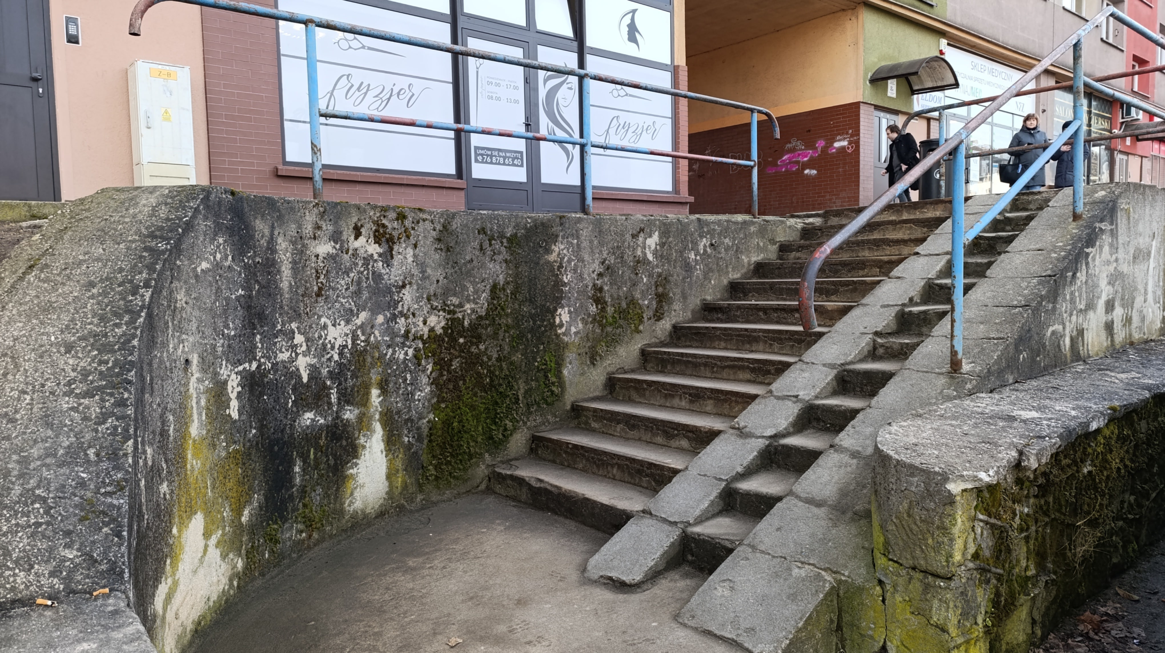 Przy ww. budynku znajdują się dwa zejścia schodowe, a jedno jest w formie betonowej wnęki wyposażonej w schody, zjazd dla wózków oraz poręcz. Niestety obecny stan tych elementów jest bardzo nieestetyczny i niefunkcjonalny. Betonowa ściana jest silnie zabrudzona,wręcz czarna i porośnięta mchem (domyślam się, iż od bardzo wielu lat nie czyszczona) oraz nieestetyczna poręcz, która dawno straciła swoją kolorystykę. Betonowy tzw zjazd dla urządzeń kołowych zatracił swoją funkcjonalność (skarżą się młode mamy z wózkami). Całość konstrukcji przestarzałych schodów z betonowym zjazdem sprawia wrażenie zaniedbania i może budzić obawy co do bezpieczeństwa użytkowników.