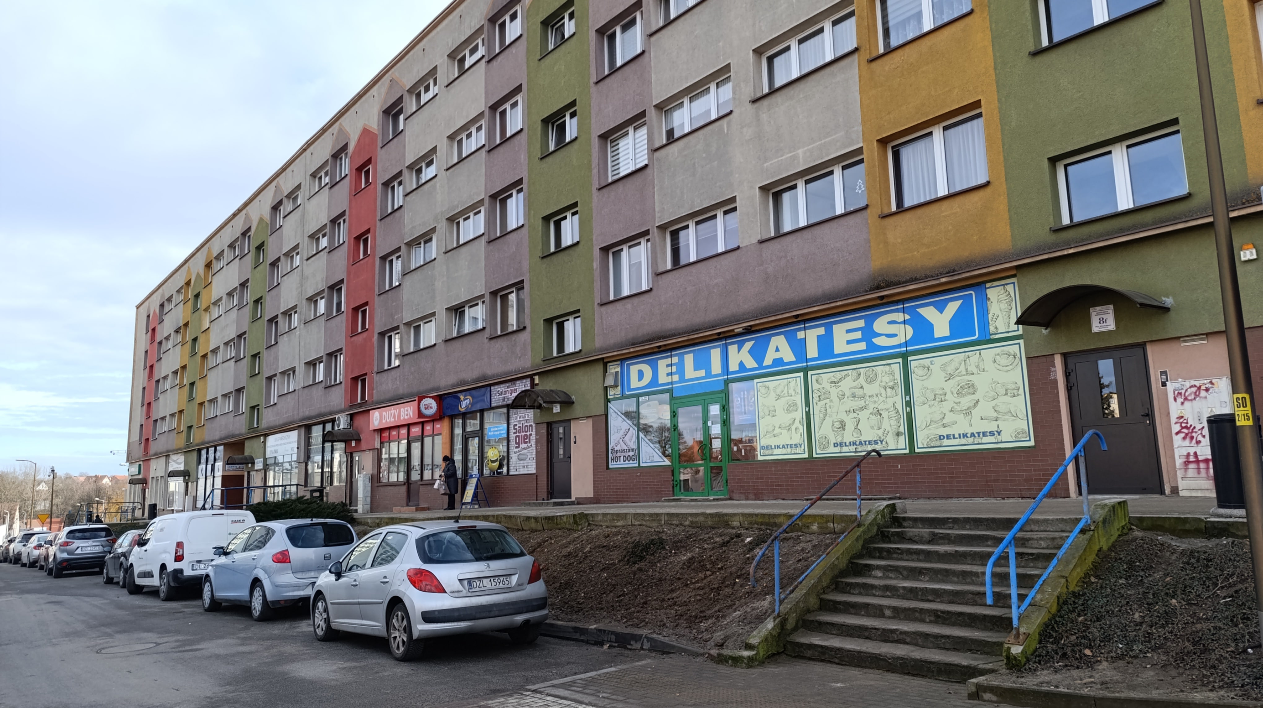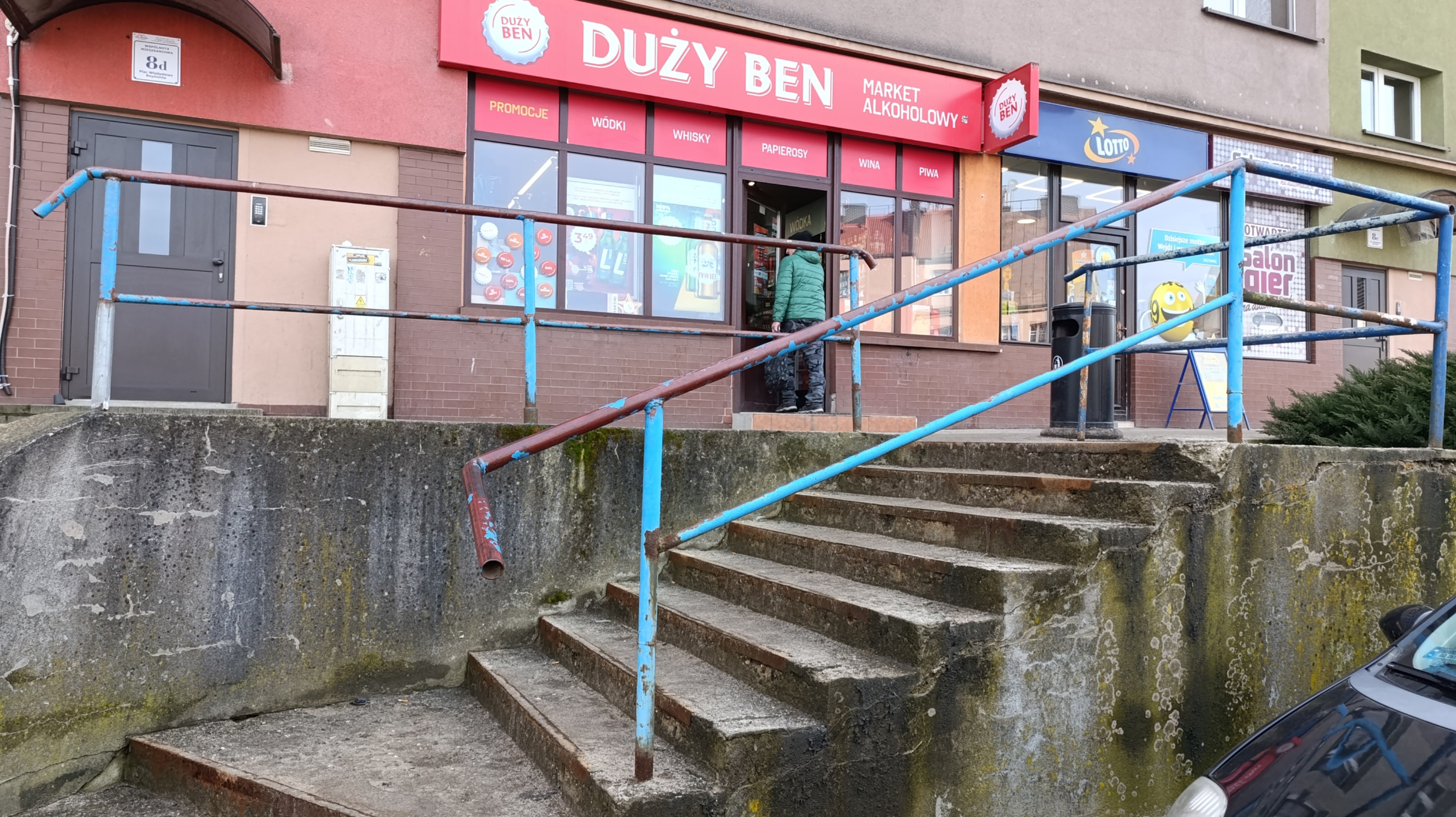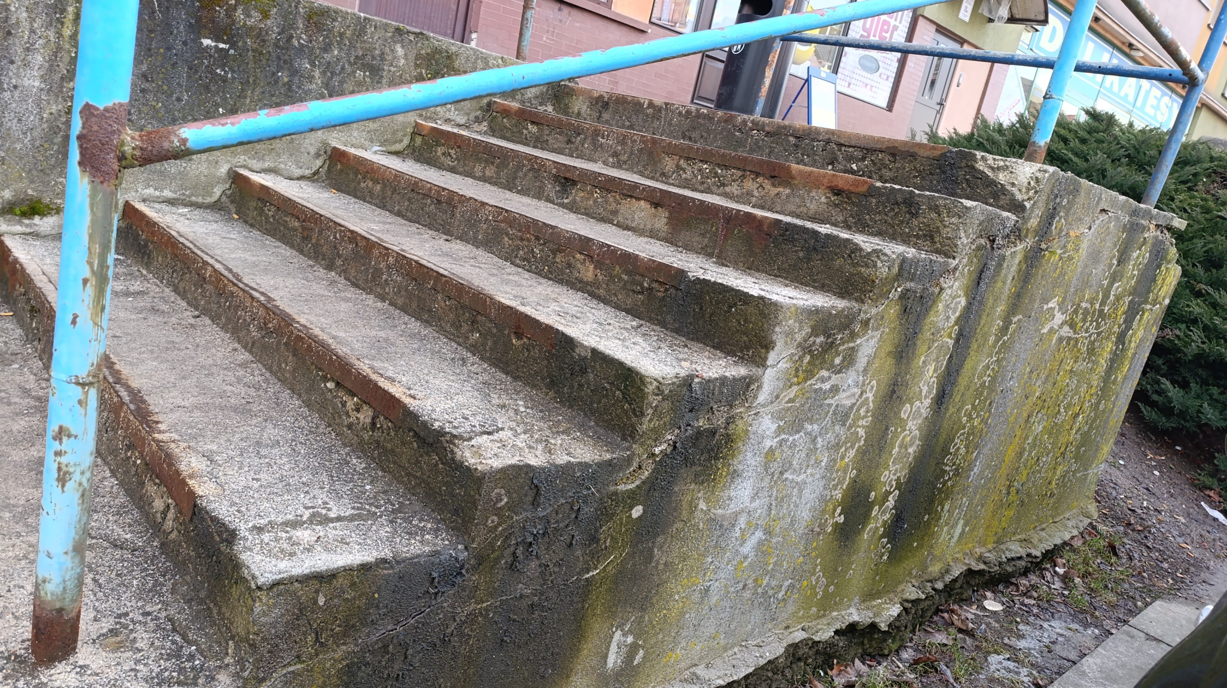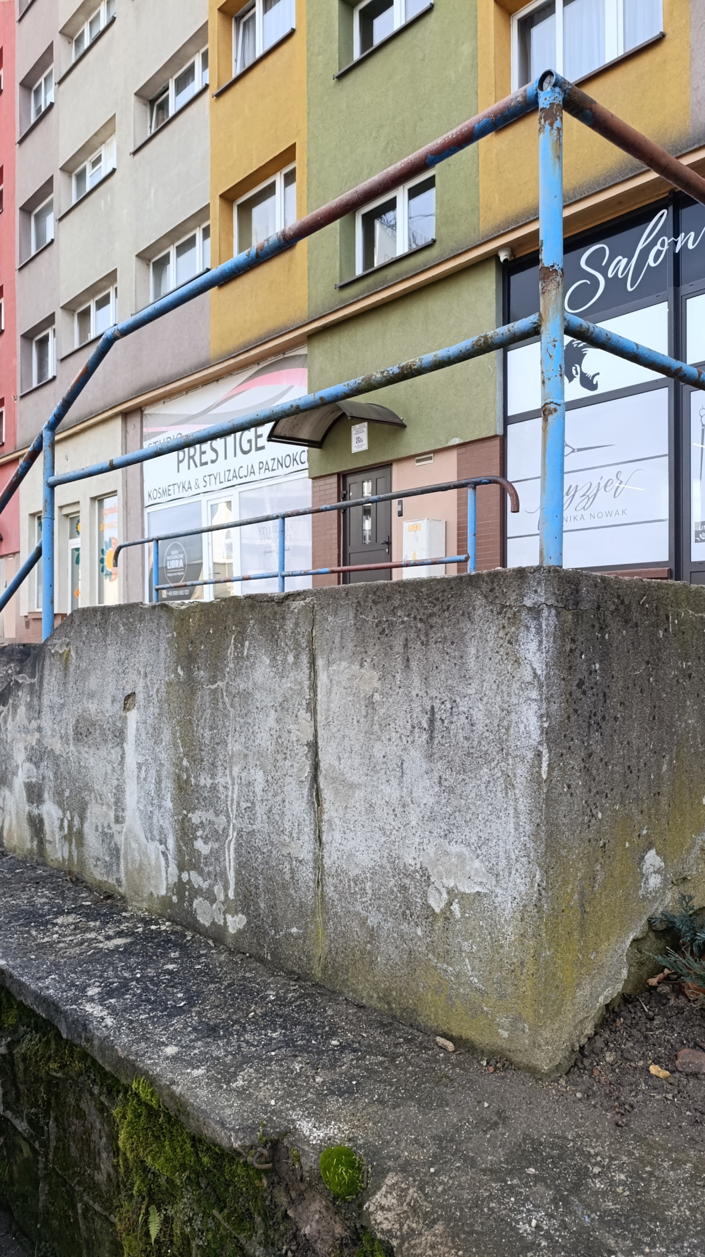 Przy ww. budynku znajdują się dwa zejścia schodowe, a jedno jest w formie betonowej wnęki wyposażonej w schody, zjazd dla wózków oraz poręcz. Niestety obecny stan tych elementów jest bardzo nieestetyczny i niefunkcjonalny. Betonowa ściana jest silnie zabrudzona,wręcz czarna i porośnięta mchem (domyślam się, iż od bardzo wielu lat nie czyszczona) oraz nieestetyczna poręcz, która dawno straciła swoją kolorystykę. Betonowy tzw zjazd dla urządzeń kołowych zatracił swoją funkcjonalność (skarżą się młode mamy z wózkami). Całość konstrukcji przestarzałych schodów z betonowym zjazdem sprawia wrażenie zaniedbania i może budzić obawy co do bezpieczeństwa użytkowników.